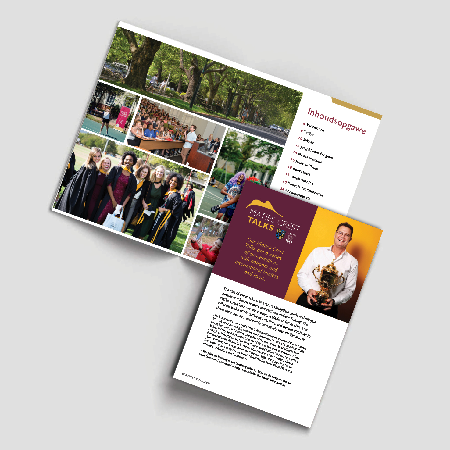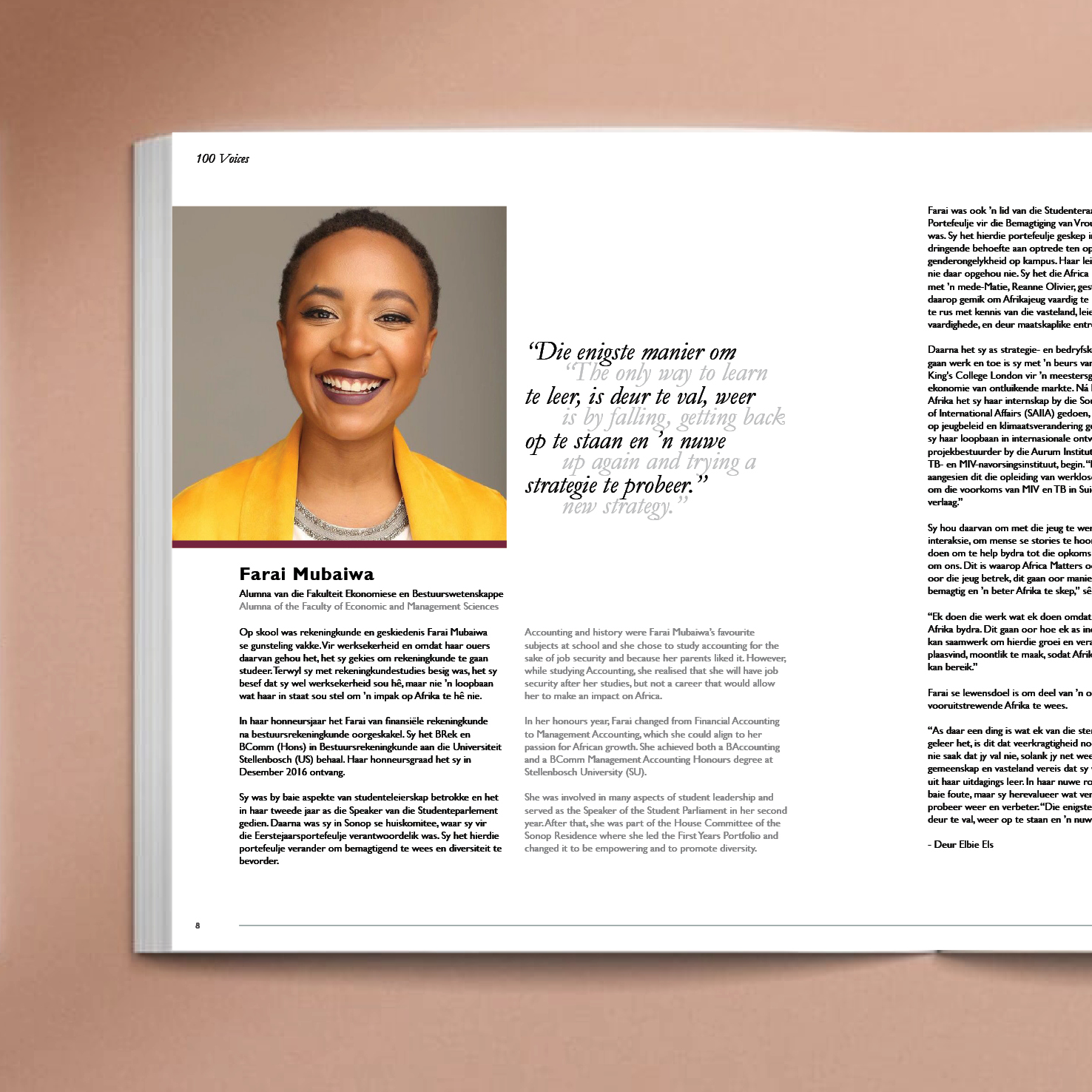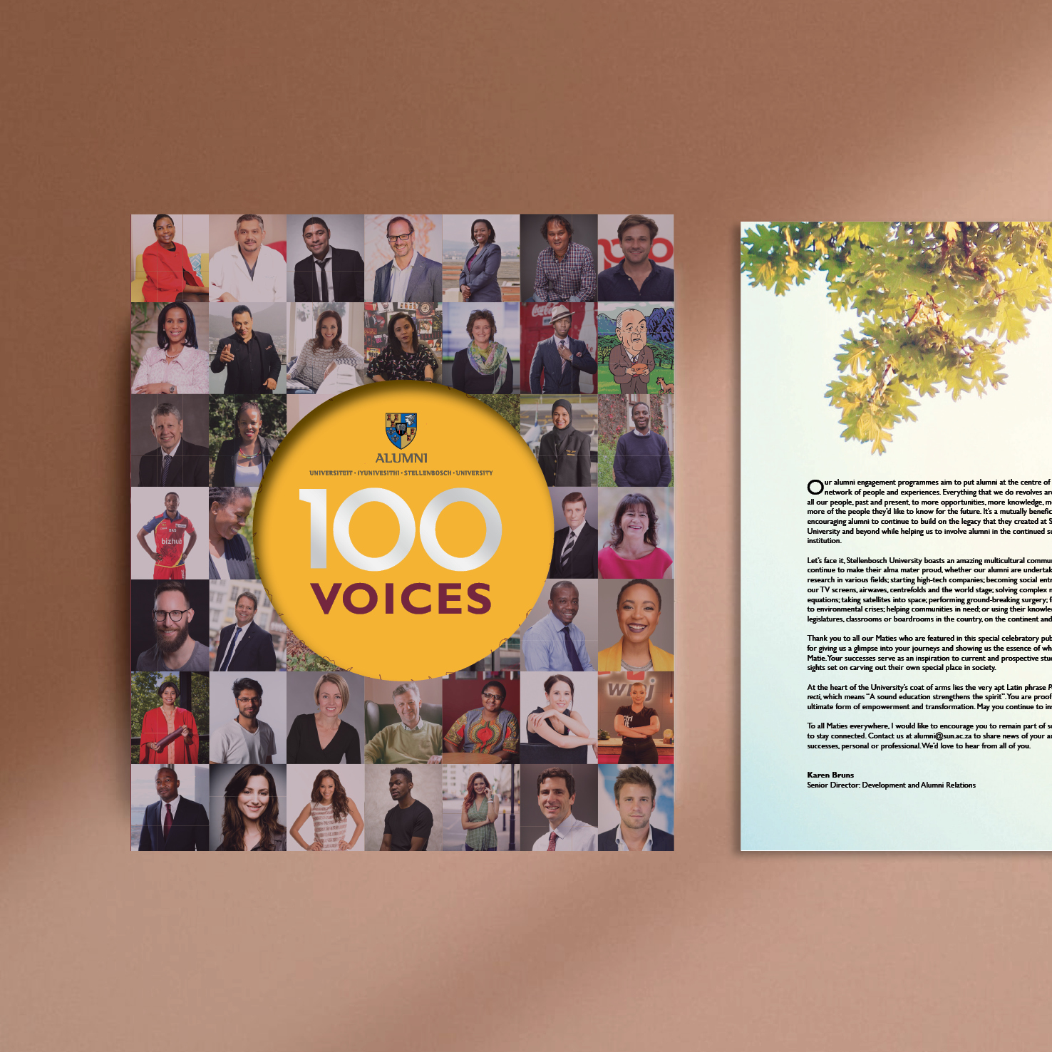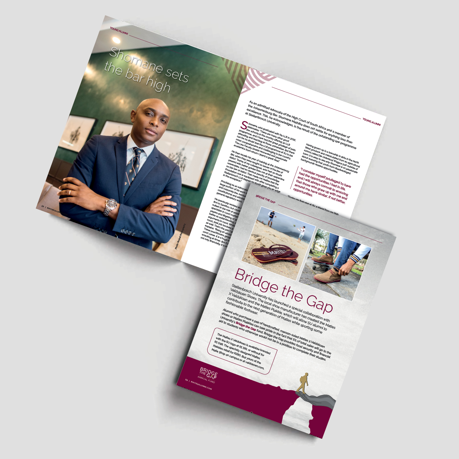 Wellness Magazine Holistica Publication Stellenbosch University 100 Voices Publication Stellenbosch University SWAN Amazing Matie Women Publication Akeibo Travel Tour Guide Isisele soLwazi Stellenbosch University Alumni Engagement Calendar Stellenbosch University Alumni Engagement Calendar For You Creative Creations Stellenbosch University Alumni Brand Collateral Stellenbosch University Department of Alumni Relations Digital Design Stellenbosch University Department of Alumni Relations Apparel Design EARTHCHILD non-profit organisation Stellenbosch University Alumni Brand Collateral Stellenbosch University Department of Alumni Relations Campaign Design Stellenbosch University Department of Alumni Relations Outdoor Branding Design Stellenbosch University Department of Alumni Relations Bridge The Gap Annual Fund Branding