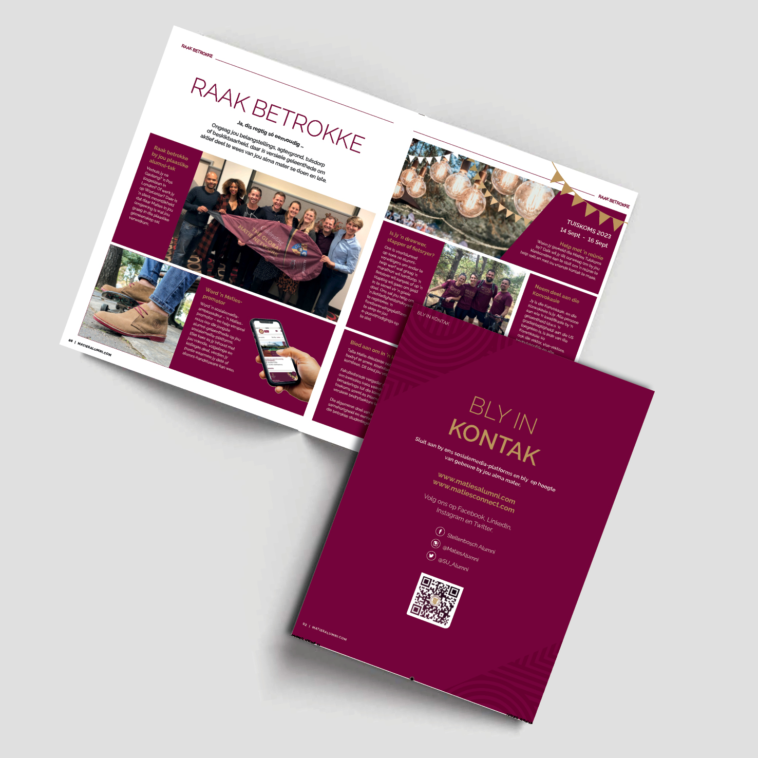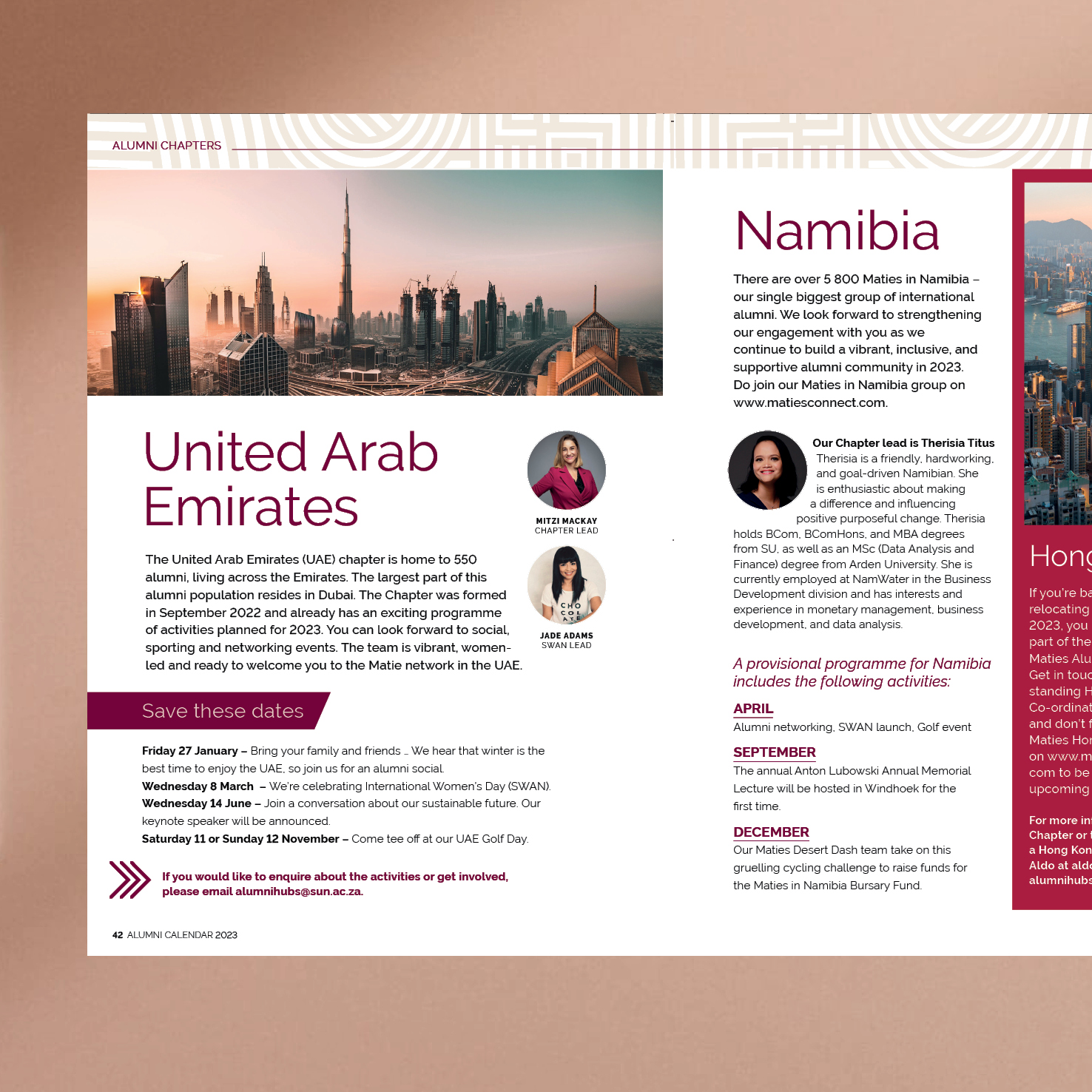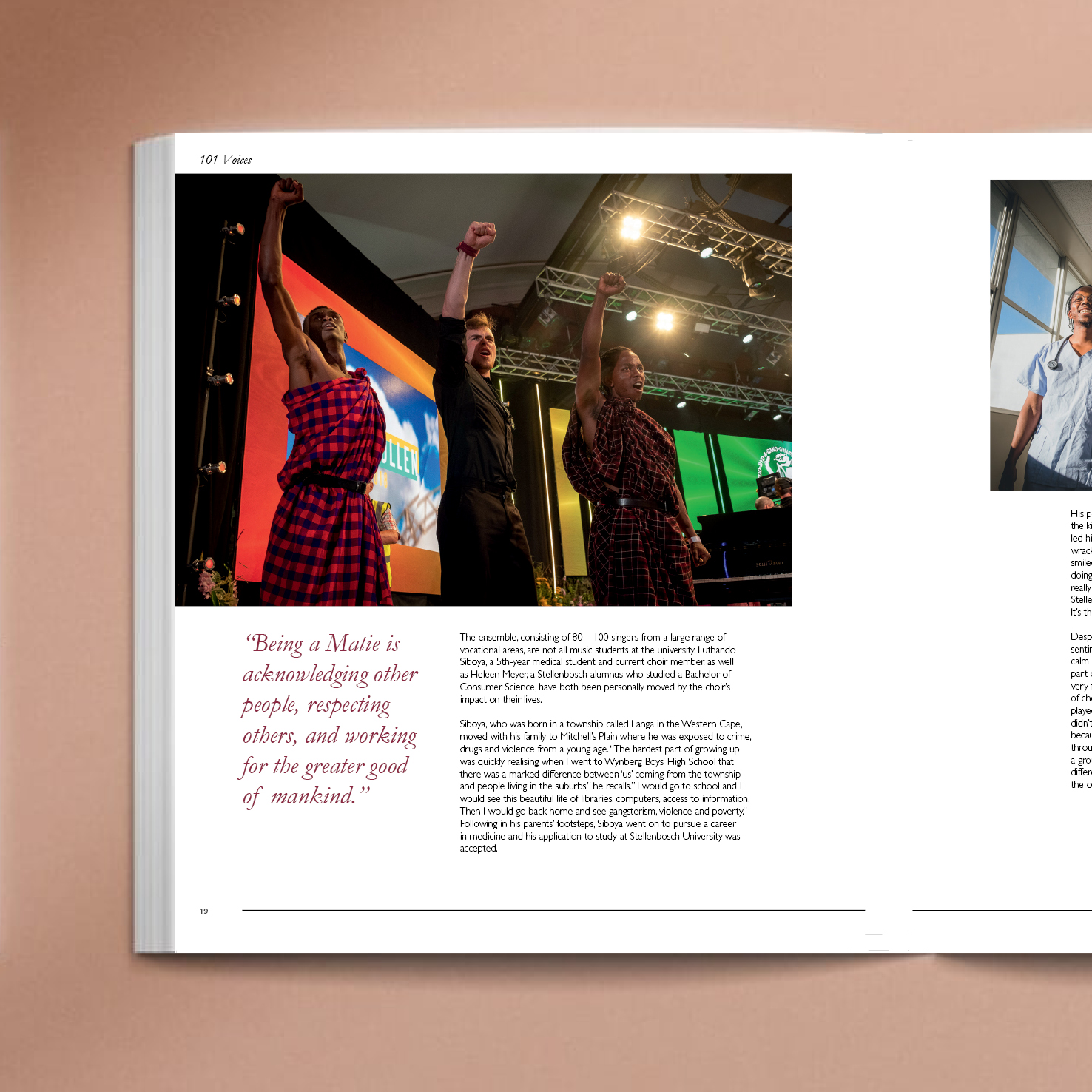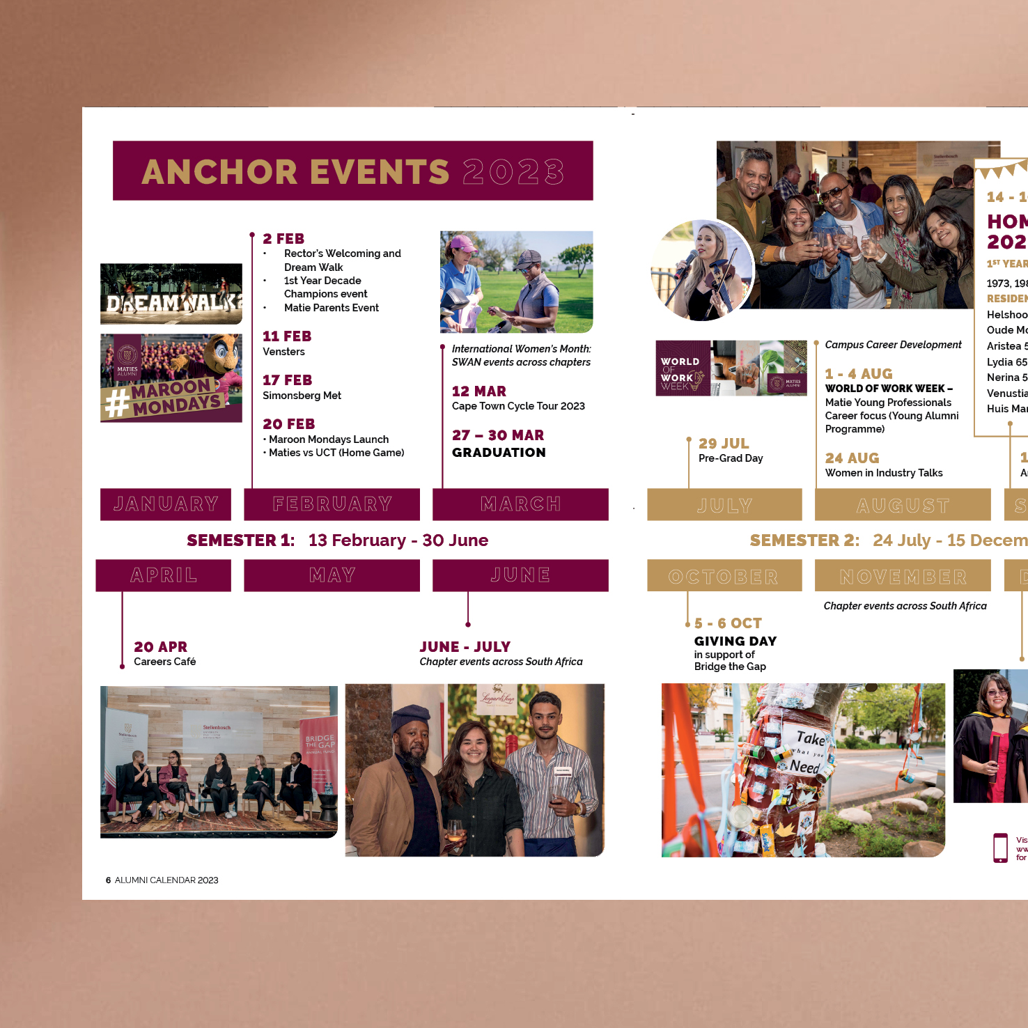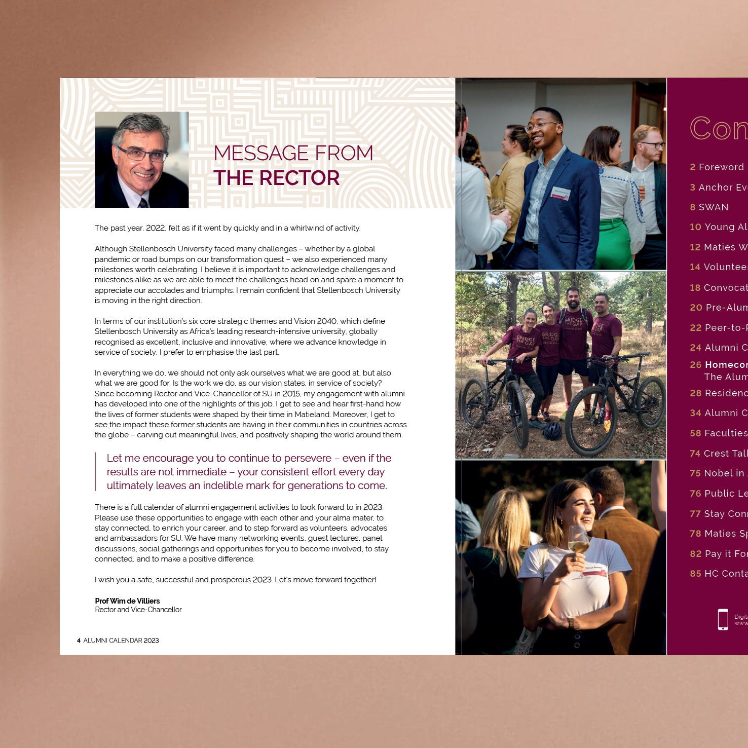 Wellness Magazine Holistica Publication Stellenbosch University 100 Voices Publication Stellenbosch University SWAN Amazing Matie Women Publication Akeibo Travel Tour Guide Isisele soLwazi Stellenbosch University Alumni Engagement Calendar Stellenbosch University Alumni Engagement Calendar For You Creative Creations Stellenbosch University Alumni Brand Collateral Stellenbosch University Department of Alumni Relations Digital Design Stellenbosch University Department of Alumni Relations Apparel Design EARTHCHILD non-profit organisation Stellenbosch University Alumni Brand Collateral Stellenbosch University Department of Alumni Relations Campaign Design Stellenbosch University Department of Alumni Relations Outdoor Branding Design Stellenbosch University Department of Alumni Relations Bridge The Gap Annual Fund Branding